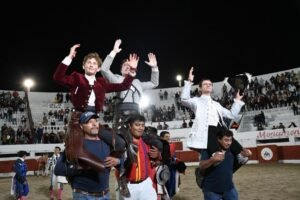 *Tras el corte de dos orejas cada uno, Miriam Cabas y Antolín Jiménez, en la localidad potosina Villa de Reyes en México, salen en hombros. La afición se le entregó