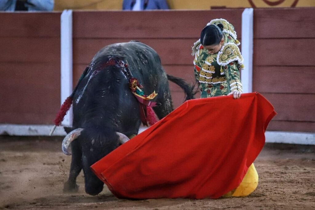 El tercero salió de toriles con un notorio acalambramiento en los cuartos traseros por lo que la novillera tuvo la habilidad de hacerlo embestir al capote de un lado a otro del ruedo en una labor muy efectiva para el posterior desarrollo de la lidia. Ya con la muleta, conectó con el público desde los primeros trazos por el pitón derecho, que era el mejor del astado. Por ahí encaminó sus tandas que estuvieron impregnadas de calidad y temple a lo largo de toda la faena. Tenía la oreja ganada pero no estuvo fina con el acero por lo que únicamente dio vuelta al ruedo, entre el cariño del público.