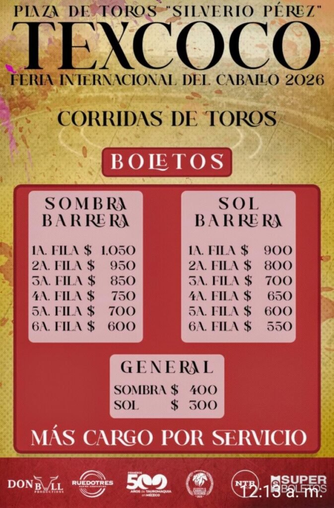 La empresa Don Bull Productions da a conocer que la venta de boletos para las cinco corridas de toros que integran este 2026 la Feria Internacional de Texcoco iniciará a partir de este jueves 12 de febrero a través de la plataforma electrónica de Súper Boletos.