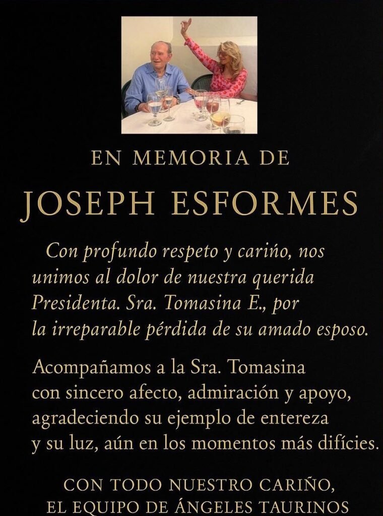 Nos unimos al dolor de la presidenta de la Fundación Los Ángeles Taurinos A.C., la señora Tomasina por el fallecimiento de su amado esposo, Joseph Esformes.