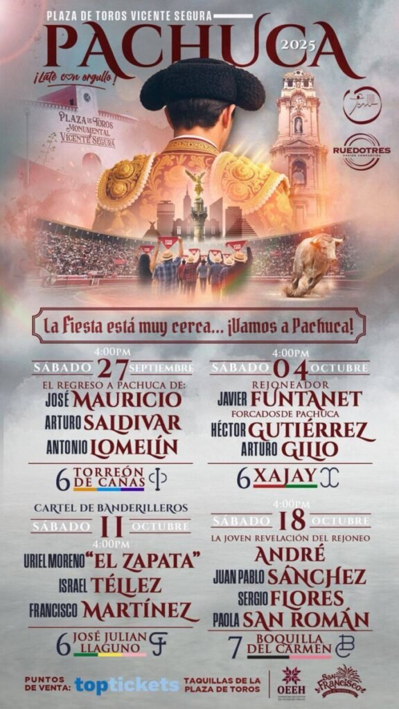 Feria Toro y Ruedo tienen todo listo para dar inicio al programa taurino de la Feria de Pachuca que presentó el pasado 1 de agosto y que incluirá cuatro corridas entre el 27 de septiembre y el 18 de octubre, las cuales se llevarán a cabo en la plaza «Vicente Segura» en la capital hidalguense.