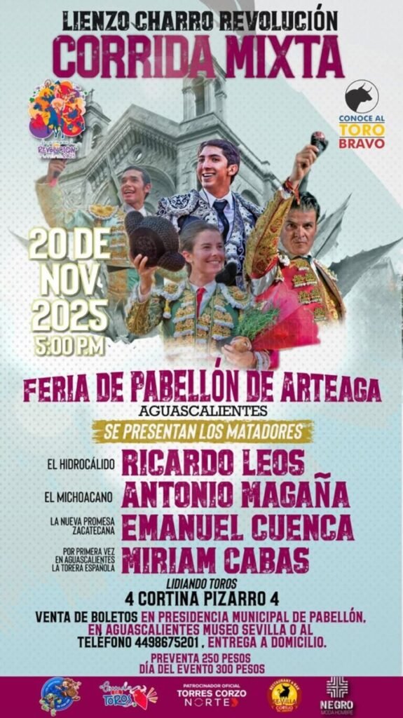 La novillera Miriam Cabas tomará parte en la corrida mixta que se llevará a cabo en la localidad hidrocálida llamada Pabellón de Arteaga en el estado de Aguascalientes el próximo 20 de noviembre a las 5 de la tarde.